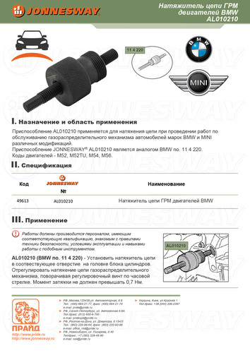 Приспособление применяется для натяжения цепи при проведении работ по обслуживанию газораспределительного механизма автомобилей марок BMW и MINI различных модификаций. Коды двигателей - M52, M52TU, M54, M56; Оригинальный номер: BMW 11 4 220. Артикул AL010210 |